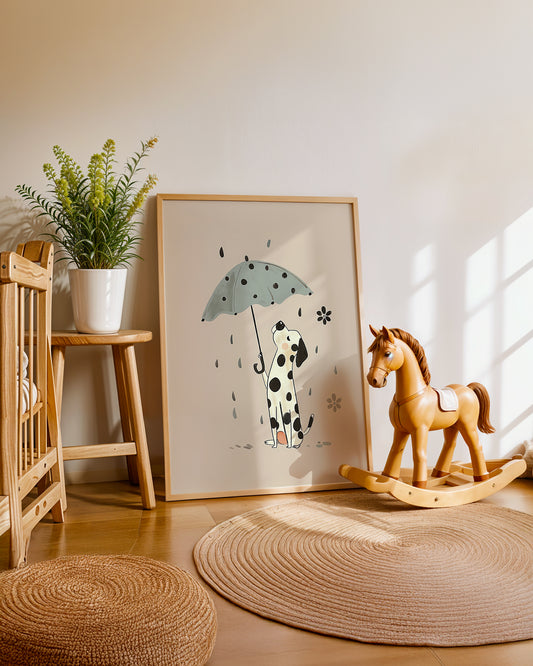 • Cuadro infantil ilustrado de perro dálmata con paraguas